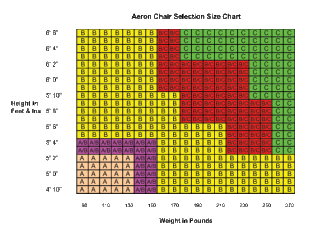 Chadwick and Stumpf designed one chair, available in three sizes to fit everybody from the 1st-percentile (female) to the 99th-percentile (male). The B size chair is designed for the largest group of people on a Gaussian Chart, the 50th-percentile or the mean. The A-size chair, which adjusts lower than the other two are designed for smaller people and the C-size chair with the larger size seat and backrest is designed for larger people.