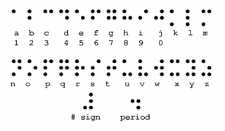 The Braille system is a method that is widely used by blind people to read and write. Braille was devised in 1821 by Louis Braille, a blind Frenchman. Each Braille character or cell is made up of six dot positions, arranged in a rectangle containing two columns of three dots each. A dot may be raised at any of the six positions to form sixty-four (26) permutations, including the arrangement in which no dots are raised. For reference purposes, a particular permutation may be described by naming the positions where dots are raised, the positions being universally numbered 1 to 3, from top to bottom, on the left, and 4 to 6, from top to bottom, on the right. For example, dots 1-3-4 would describe a cell with three dots raised, at the top and bottom in the left column and on top of the right column, i.e., the letter m. The lines of horizontal Braille text are separated by a space, much like visible printed text, so that the dots of one line can be differentiated from the Braille text above and below. Punctuation is represented by its own unique set of characters.