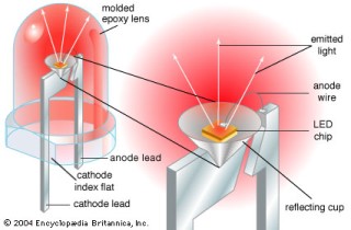 LEDs are based on the semiconductor diode. When the diode is forward biased (switched on), electrons are able to recombine with holes and energy is released in the form of light. This effect is called electroluminescence and the color of the light is determined by the energy gap of the semiconductor. The LED is usually small in area (less than 1 mm2) with integrated optical components to shape its radiation pattern and assist in reflection.