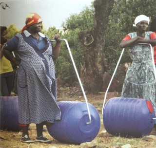 The Hippo water roller, or Hippo roller, is a device for carrying water more easily and efficiently than traditional methods, particularly in the developing world. It consists of a barrel-shaped container which holds the water and can roll along the ground, and a handle attached to the axis of the barrel. Currently deployed in rural Africa, its simple and purpose-built nature makes it an example of appropriate technology. [...] The barrel, originally called 'Aqua Roller', was the brainchild of two engineers, Pettie Petzer and Johan Jonker, who had previously been involved in the development of military materiel during apartheid in South Africa.